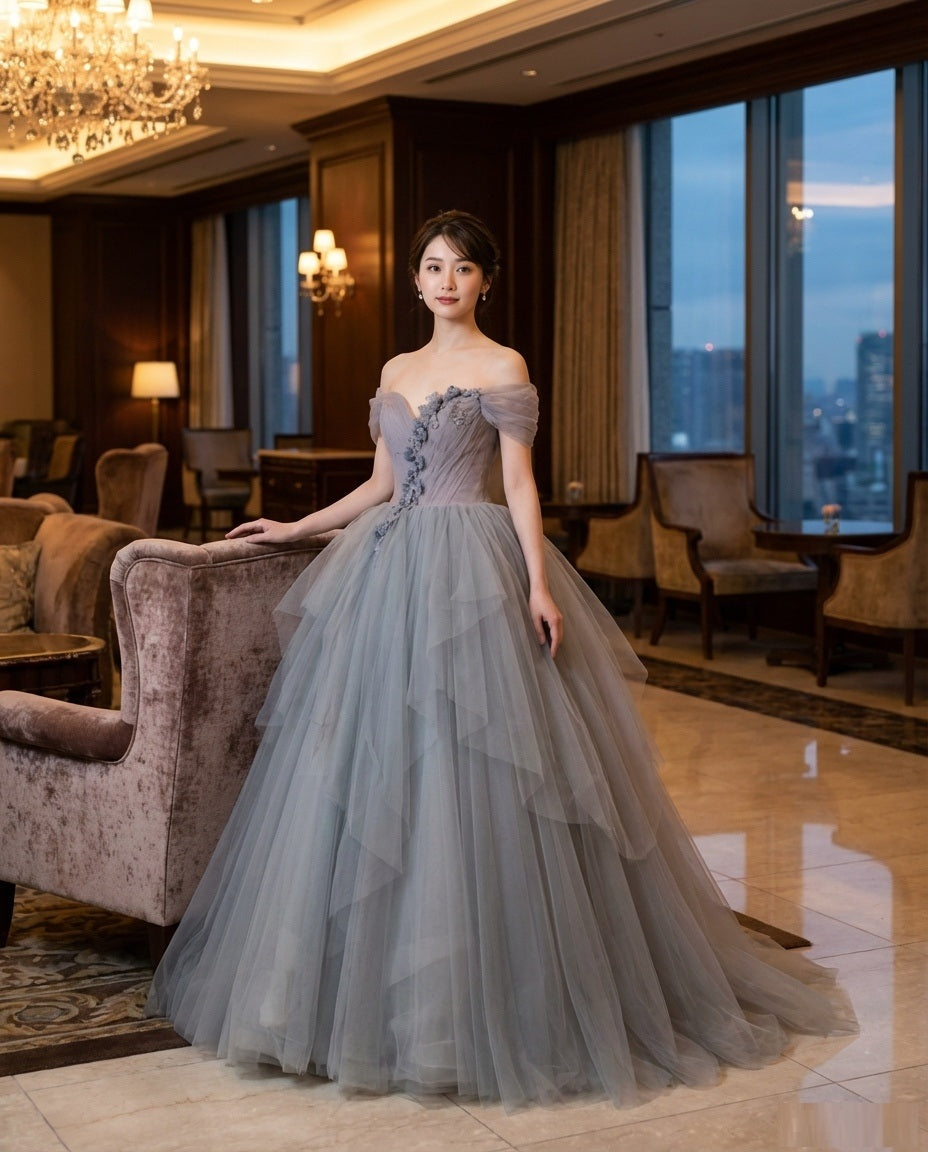 Naia (着丈 サイズオーダー可能) Aラインドレス ロングドレス オーダーメイド 高級ドレス パーティードレス フォーマルドレス チュールドレス ノースリーブドレス 演奏会ドレス 晩餐会 ホテルラウンジ 夜景映え シルバーグレー 透明感発光 繊細ラメ 上質シアー素材 ボリュームシルエット 体型美補正 大人の余裕 気品ある佇まい 静かな美しさ 主役級存在感 日本人女性向け(グレー)