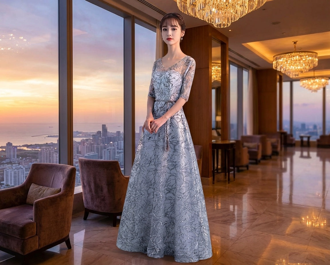 Celina ロングドレス (着丈 サイズオーダー可能) オーダーメイド Aラインドレス パーティードレス フォーマルドレス 高級ドレス ノースリーブドレス グレードレス シフォン素材 透明感 大人女性 ラグジュアリーホテル 大階段 シャンデリア光 柔光ライティング 気品 特別な夜 (グレー)