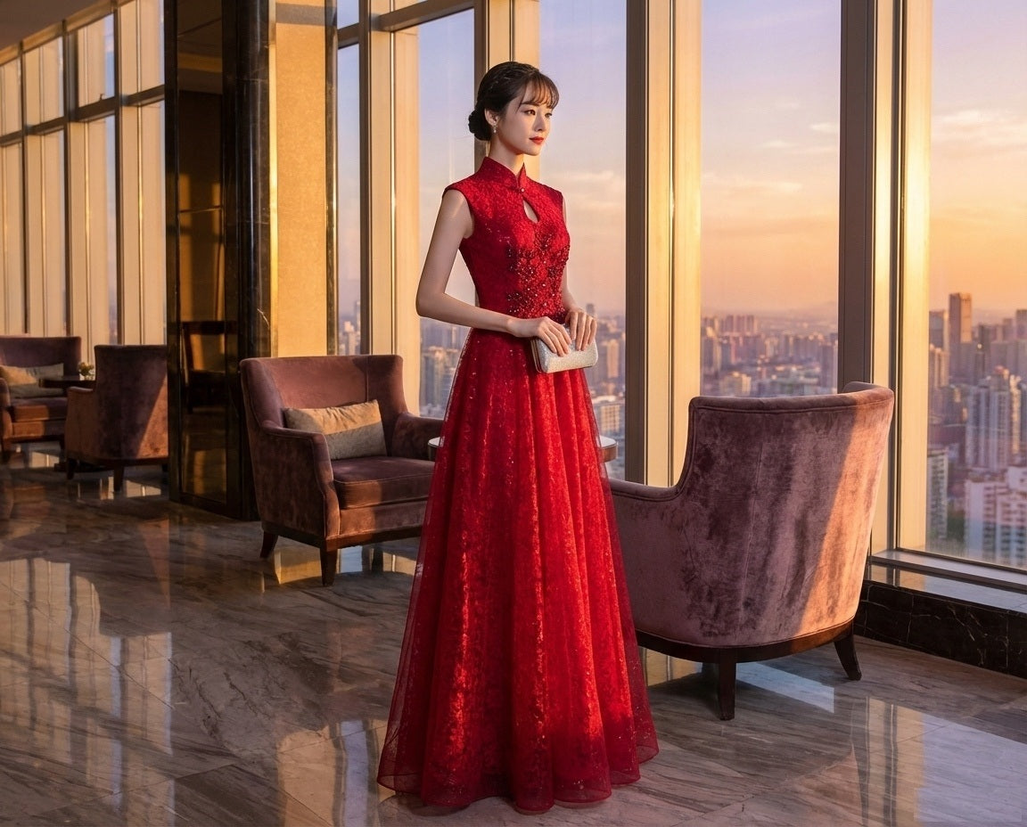 oriana ロングドレス (着丈 サイズオーダー可能) オーダーメイド Aラインドレス パーティードレス フォーマルドレス 結婚式ドレス レッドドレス ノースリーブドレス ウエスト切替 高級ドレス 華やか 大人女性 ラグジュアリーホテル 高層ラウンジ サンセットライティング 艶感素材 気品 特別な夜 (レッド)XS S M L XL XXL XXXL