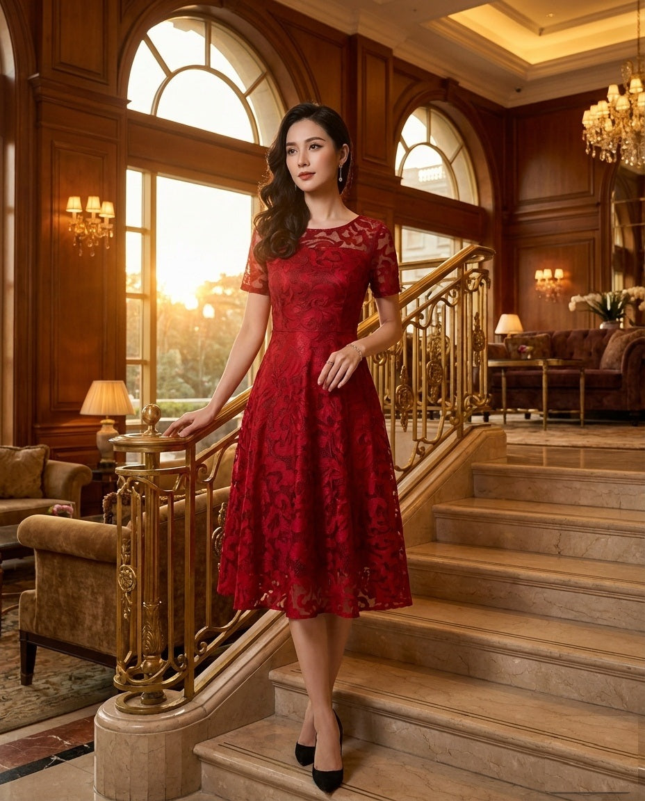 risler (着丈 サイズオーダー可能) Aラインドレス レースドレス ロングドレス オーダーメイド 高級ドレス レッドドレス フォーマルドレス パーティードレス 結婚式 二次会 演奏会 宮殿ホテル 大階段 シャンデリア 総レース 上質素材 フレアライン 美シルエット 大人女性 気品 透明感 華やか 主役級存在感 日本人女性 (レッド)