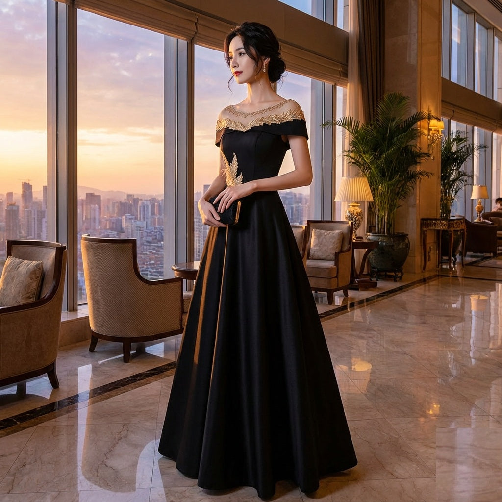 saraha (着丈 サイズオーダー可能) オーダーメイド ブラックドレス ロングドレス オフショルダードレス サテンドレス ウエストリボン 美シルエット 気品 大人女性 日本人女性 体型補整 ホテル夕景 特別な夜 フォーマル パーティー (ブラック)XS S M L XL XXL XXXL