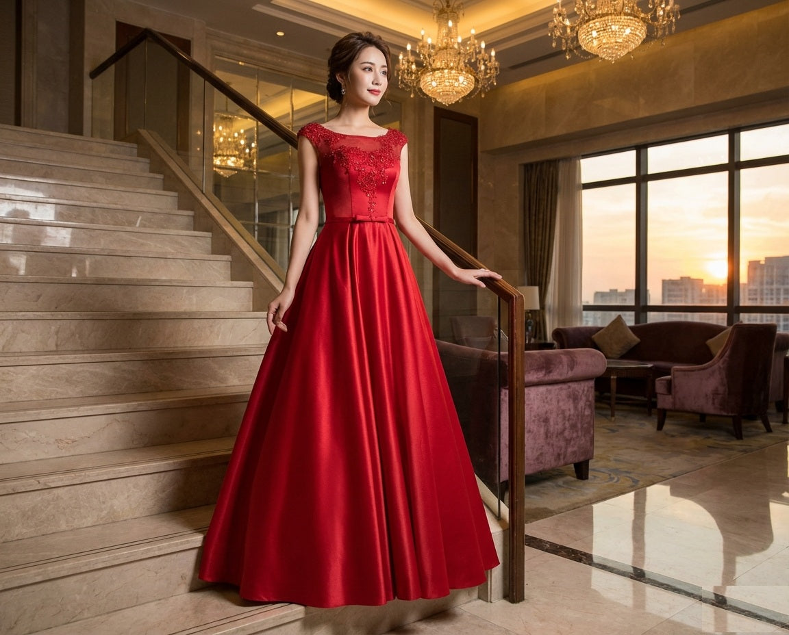 scottisch (着丈 サイズオーダー可能) オーダーメイド レッドドレス ロングドレス Aラインドレス サテンドレス 美シルエット 主役感 気品 華やか 日本人女性 体型補整 ホテル空間 特別な夜 パーティー 結婚式 (レッド)XS S M L XL XXL XXXL