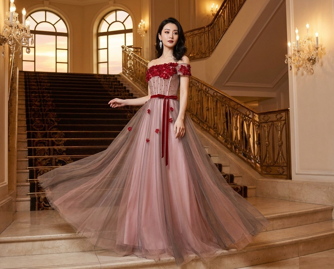 teresar オーダーメイド (着丈 サイズオーダー可能) ロングドレス Aラインドレス フィッシュテールドレス ノースリーブドレス チュールドレス ビジュー装飾 フラワーモチーフ 切替ウエスト 美シルエット 体型補整 上質素材 高級感 気品 透明感 大人女性 日本人女性 クラシックホテル 大階段 シャンデリア 夕景 フォーマル パーティー 演奏会 二次会 特別な夜 (レッド)XS S M L XL XXL XXXL