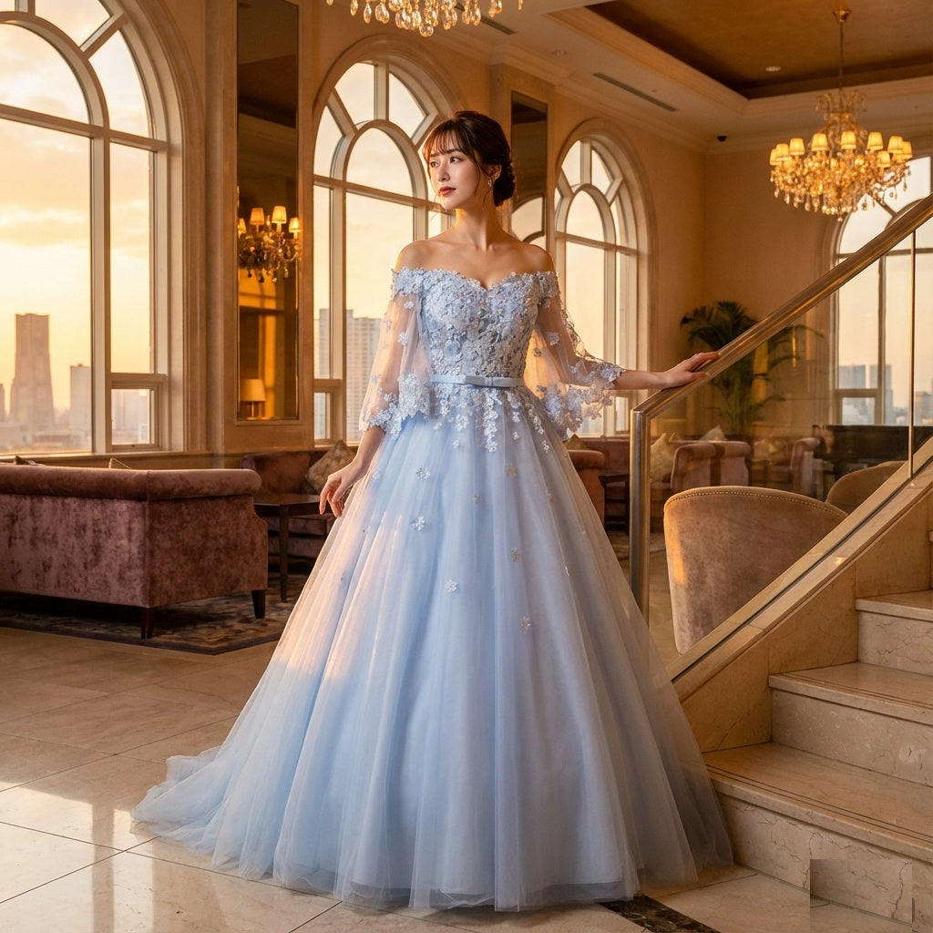 wisteria Aラインドレス (着丈 サイズオーダー可能) オーダーメイド ロングドレス チュールドレス レース刺繍 オフショルダー 上質素材 透明感 優美シルエット 体型補整 大人上品 ホテルラウンジ 特別な夜 フォーマル ラグジュアリー (水色)XS S M L XL XXL XXXL